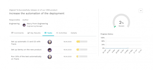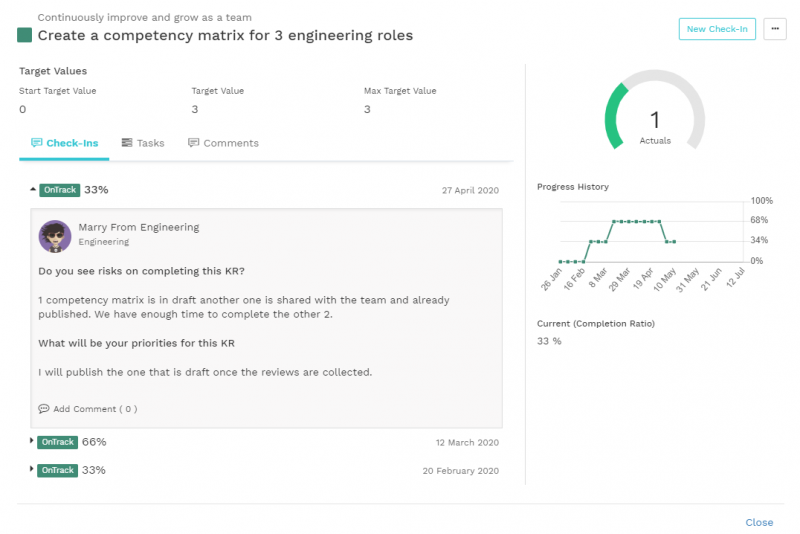 Thanks to the simple and easy user interface, creation and quarterly tracking of OKRs is no longer a problem. Keep track of Key result progress by weekly check-ins.