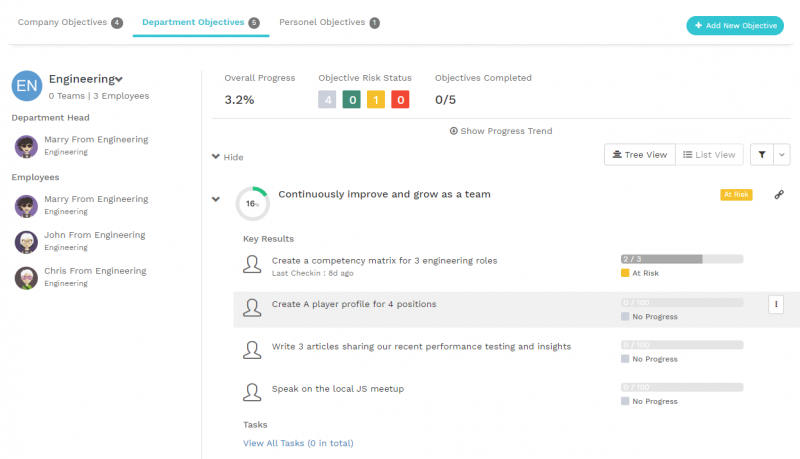 Start with creating strategic company Objectives that drive the mission and vision forward. Assign Key results which define how these objectives will be attained with specific, measurable actions and within a set time frame. Company OKRs are then translated into department and individual OKRs.