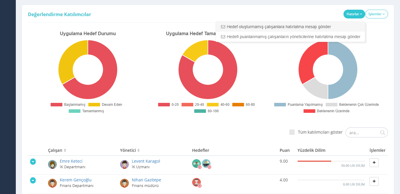 Ik yöneticilerinin çalışanlarının hedeflerini puanlamamış yöneticilere ve hedef oluşturmamış çalışanlara hatırlatma mesajı göndermesini sağladık.