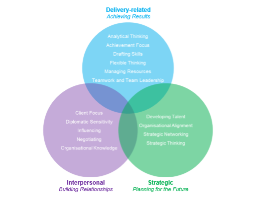 OECD, personelinden beklediği temel yetkinlikleri 3 ana gruba ayırmış bunları strateji geliştirmek, İlişki Geliştirmek ve Sonuç Odaklılık olarak adlandırmıştır.